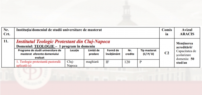 A Romániai Felsőoktatás Minőségét Ellenőrző Bizottság (ARACIS) 2020. január 30-án tartott ülésén újraakkreditálta a Teológiai Intézet magiszteri képzését.