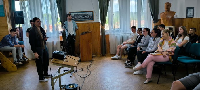 A tanórákat követően mindegyik képviselő szót kaphatott, hiszen az iskola dísztermében két végzős osztály diákjai meghallgatták a teológusok által előkészített bemutatót. Koppándi Botond Péter teológiai tanár köszöntő szavai után személyes történetek, élménybeszámolók hangzottak el a hallgatók részéről, emellett a Teológiai Intézetben folyó tanításról, az egyetemen kívüli diákéletről, ifjúsági egyletről is ejtettek pár szót. Pár motiváló megjegyzés után, az Intézet hivatalos bemutató videójának rövidebb változatát vetítették ki az érettségi vizsga előtt álló diákoknak. Az Intézet megismertetését segítő bemutató után a teológiai hallgatók azzal a nagy reménnyel távoztak a főépületből, hogy majd lesz olyan diák, akivel sorstársakká formálódhatnak, akivel szeptemberben újra találkoznak a kincses városban. A gimnázium konviktusán ebéddel zárták látogatásukat, kiértékelve az elmúlt napok hasznosságát.
