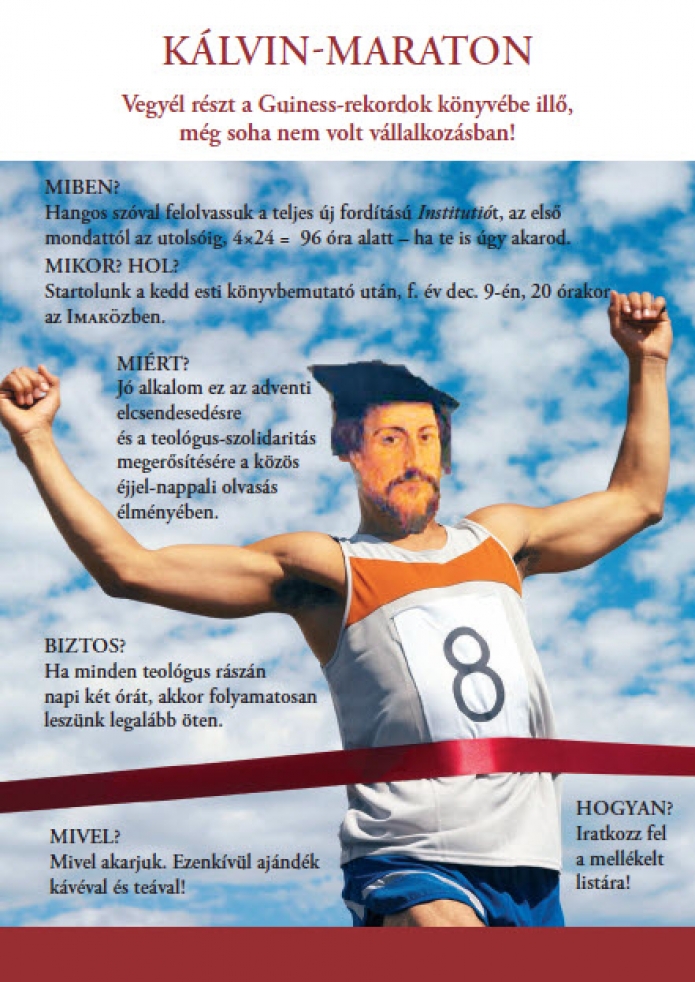 A Kálvin Institutiojának Buzogány Dezső által készített bemutatása után indult annak a merész elképzelésnek a megvalósítása, hogy a teljes újfordítású Tanítást közösen, egymást a hangos olvasásban váltogatva – diákok és tanárok, sőt, azok családtagjai, valamint más érdeklődők részvételével – önkéntes résztvevők végigolvassák. Az Intézet Imaköz-termében megszakítás nélkül, éjjel-nappal tartó Kálvin-maraton kerek hetven órán keresztül különös alkalmat jelentett minden résztvevőnek: a hitben és ismeretben egyaránt építő közösségi élmény felejthetetlen tapasztalatát. A december 9-én, kedd este 9 órakor kezdődő felolvasás péntek délután 6 óra körül közeledett a végcélhoz; az utolsó oldalakat ismét a díszteremben olvasták a résztvevők, az utolsó bekezdést pedig maga a fordító. Dr. Buzogány Emese hálaadó imája, majd szeretetvendégség zárta e rendkívüli együttlétet.