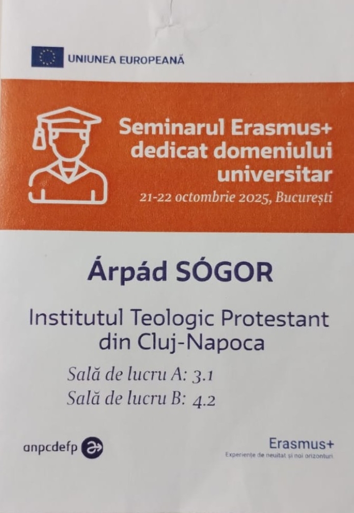 În perioada 21–22 octombrie 2025, Institutul Teologic Protestant din Cluj-Napoca a fost reprezentat la seminarul național Erasmus+ dedicat domeniului universitar, organizat de Agenția Națională pentru Programe Comunitare în Domeniul Educației și Formării Profesionale (ANPCDEFP) și de Ministerul Educației, în cadrul Bibliotecii Centrale a Universității Naționale de Știință și Tehnologie Politehnica București.